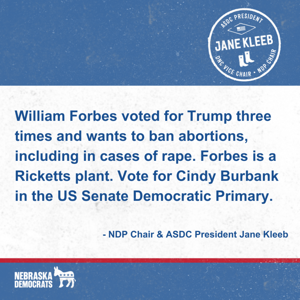 FOR IMMEDIATE RELEASE March 3, 2026 Contact: José Flores, Jr., Communications Director 402-215-1052, jose@nebraskademocrats.org ***Nebraska Democratic Party News Press Release for 3-3-2026*** Nebraska Democratic Party Statement on US Senate Candidate William Forbes Decieving Nebraskan Voters LINCOLN, NE – The Nebraska Democratic Party Chair and ASDC President Jane Kleeb issued the