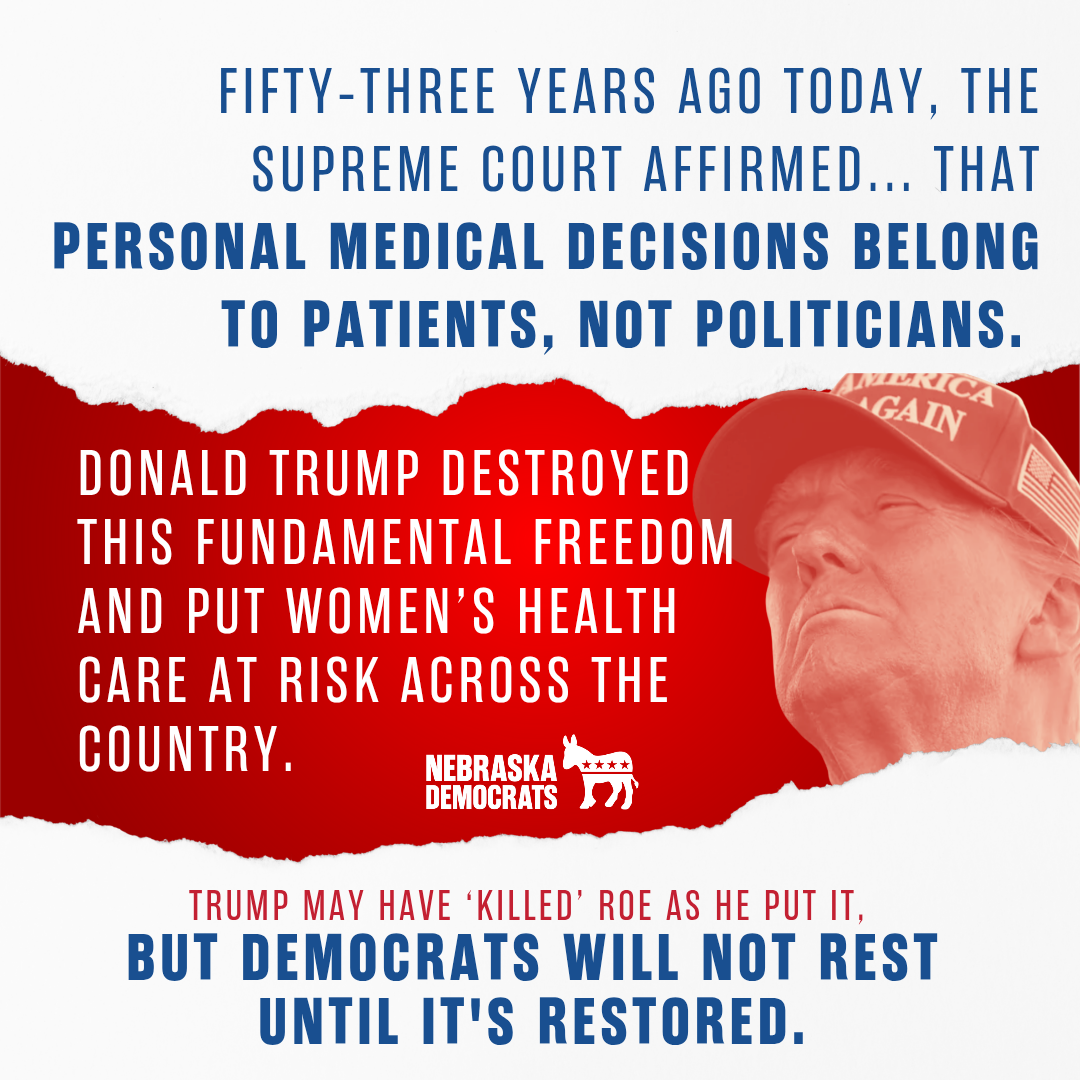 “Fifty-three years ago today, the Supreme Court affirmed a simple but powerful principle in Roe v. Wade: that personal medical decisions belong to patients, not politicians.